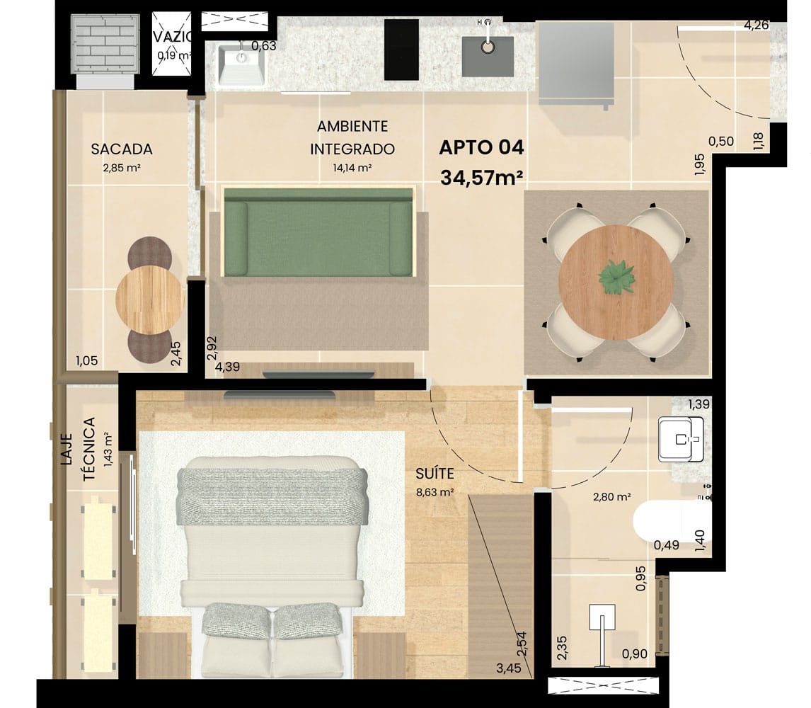 Ambiente Integrado (sala + cozinha): 14,14 m²