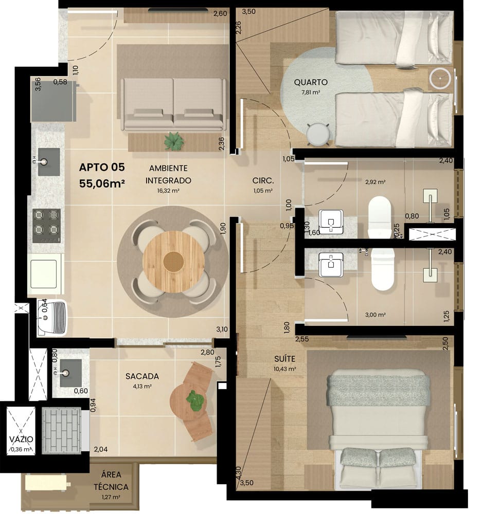 Ambiente Integrado (sala + cozinha): 16,32 m²